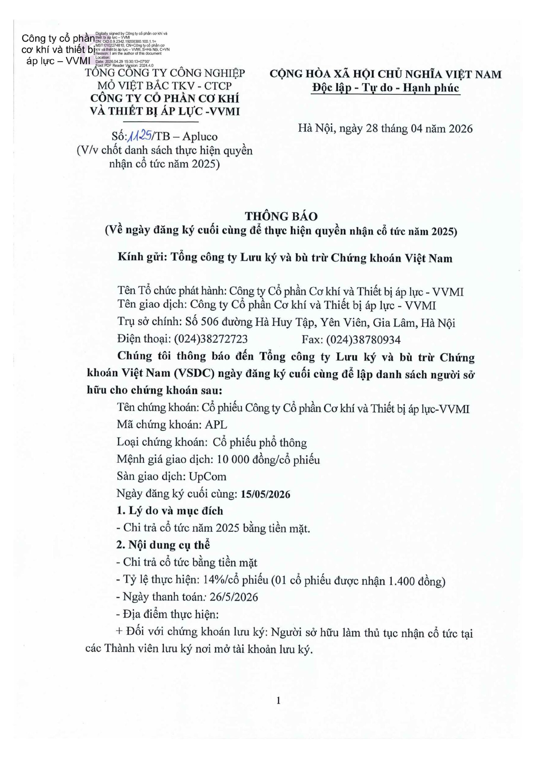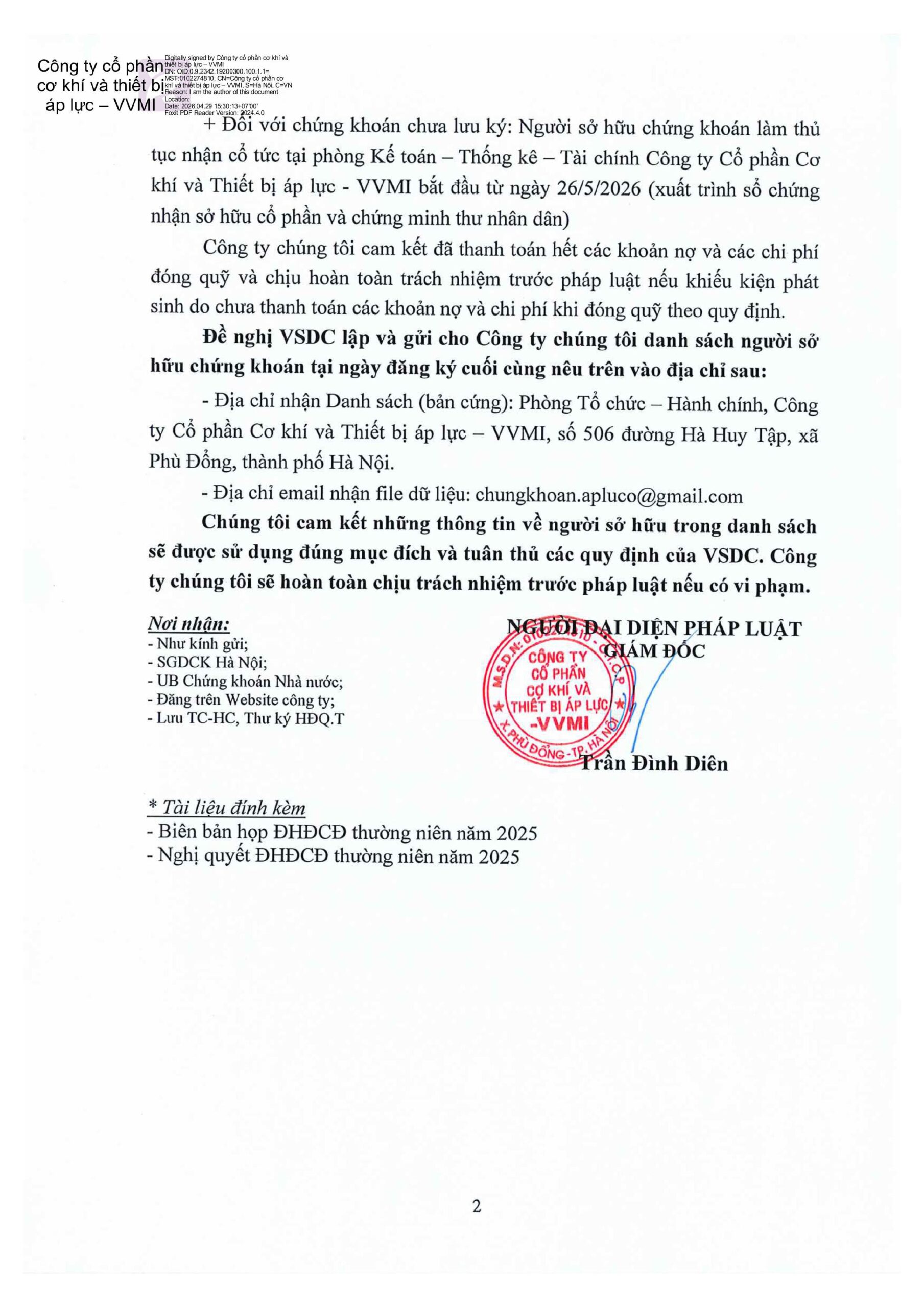 Thông báo ngày đăng ký cuối cùng thực hiện quyền nhận cổ tức năm 2025